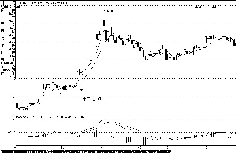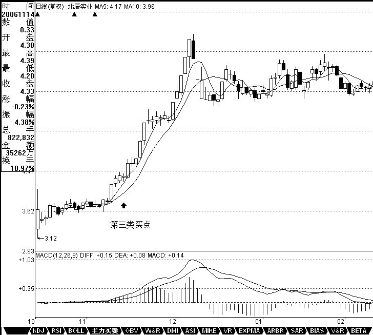 例如,工商银行在12月14日构成典型的日线级别第三类买点;北辰实业在11月14日构成典型的日线级别第三类买点;000803在1月20日构成典型的日线级别第三类卖点。注意,第三类买卖点比第一、二类要后知后觉,但如果抓得好,往往不用浪费盘整的时间,比较适合短线技术较好的资金,但一定要注意,并不是任何回调回抽都是第三类买卖点,必须是第一次。而且,第三类买卖点后,并不必然是趋势,也有进入更大级别盘整的可能,但这种买卖之所以必然赢利,就是因为即使是盘整,也会有高点出现。操作策略很简单,一旦不能出现趋势,一定要在盘整的高点出掉,这和第一、二类买点的策略是一样的(娇注:一买后不突破长期均线依旧男上位缠绕盘整,二买后破一买低点退出)。