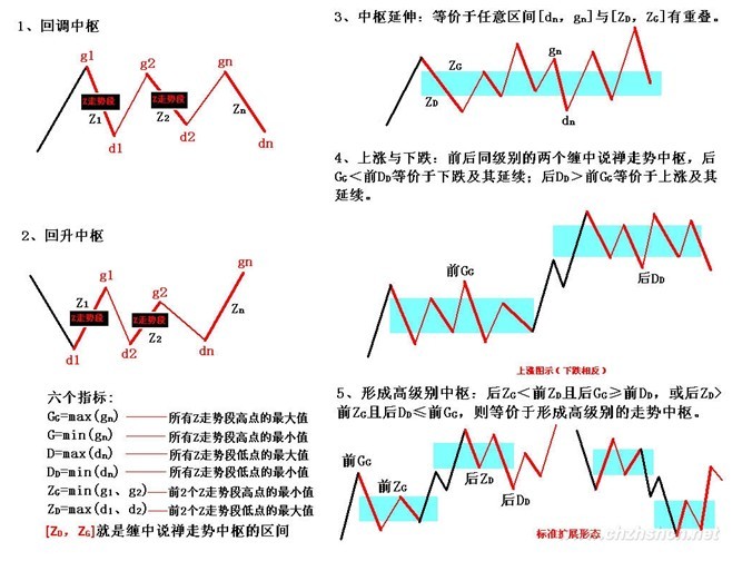 对于第一种有a1=b1,b2=c2;对第二种有a2=b2,b1=c1。但无论是哪种情况,中枢的公式都可以简化为[max(a2,c2),min(a1,c1)]。显然,A、C段,其方向与中枢形成的方向是一致的,由此可见,在中枢的形成与延伸中,由与中枢形成方向一致的次级别走势类型的区间重叠确定。例如,回升形成的中枢,由向上的次级别走势类型的区间重叠确定,反之依然。为方便起见,以后都把这些与中枢方向一致的次级别走势类型称为Z走势段,按中枢中的时间顺序,分别记为Zn等,而相应的高、低点分别记为gn、dn,定义四个指标:GG=max(gn),G=min(gn),D=max(dn),DD=min(dn),n遍历中枢中所有Zn。