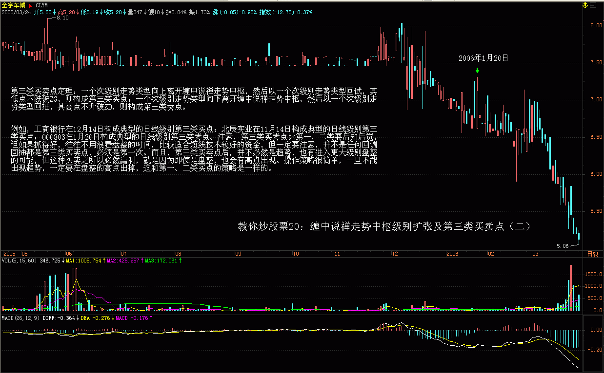 宁沪上在那段时间根本就没有什么第三类买点,反而是一个第一类买点很清楚。 并不是有中枢就有第三类买点的,因为中枢是可以延伸、还可以扩张的。必须符合第三类买点所必须满足的条件才有第三类买点、卖点也一样。