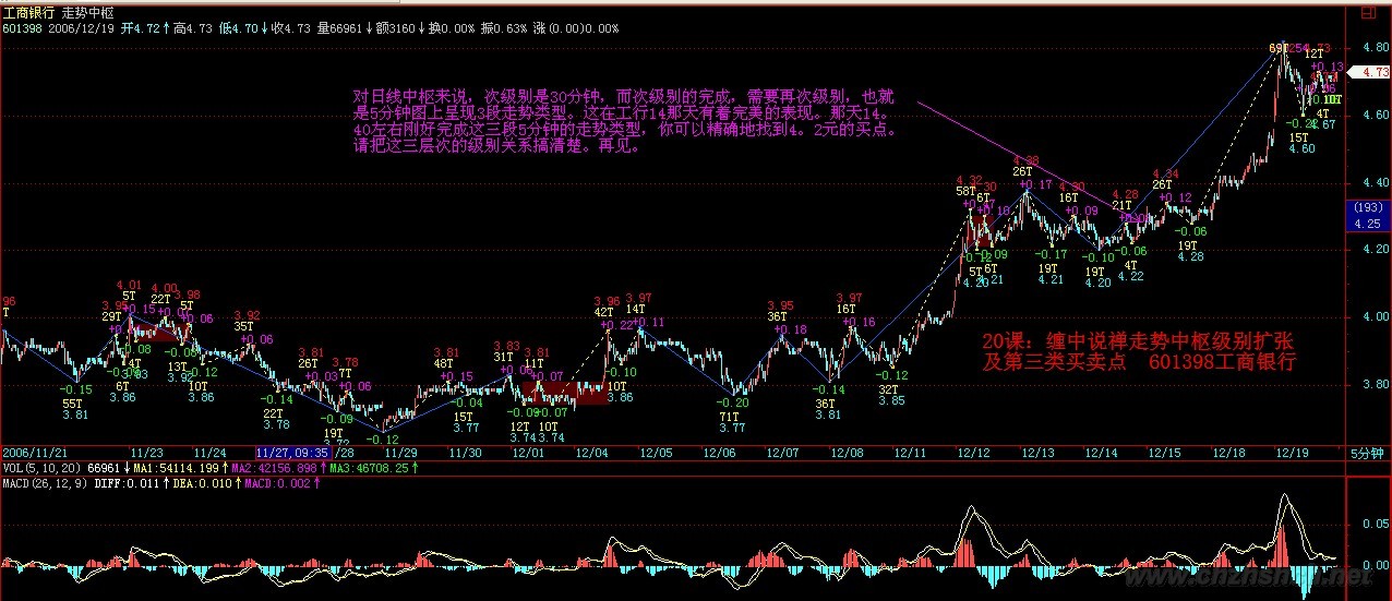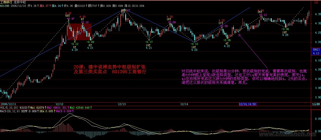 临走回答你,搞清楚,是看哪个级别的。 对日线中枢来说,次级别是30分钟,而次级别的完成,需要再次级别,也就是5分钟图上呈现3段走势类型。这在工行14那天有着完美的表现。那天14。40左右刚好完成这三段5分钟的走势类型,你可以精确地找到4。2元的买点。请把这三层次的级别关系搞清楚。