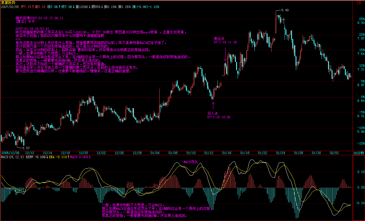 昨日用缠姐教的第三类买点在6.64买入600196,今日7.36卖出原因是30分钟出现macd背离,且量价也背离,但后市又拉起,我的这次操作有什么问题吗?请缠姐指教
